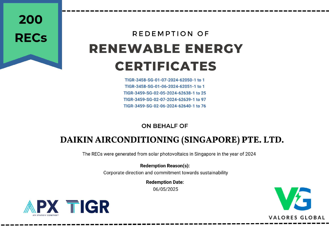 Daikin Singapore has demonstrated its commitment to sustainability by redeeming Renewable Energy Certificates (RECs). The redemption of RECs represents Daikin Singapore's support for renewable energy generation and its contribution to the decarbonization of the energy sector. Each REC represents one megawatt-hour of renewable energy generation, which could come from sources such as solar, wind, or hydroelectric power. By purchasing and redeeming these certificates, Daikin Singapore is effectively funding the development and expansion of renewable energy projects, which in turn helps to reduce greenhouse gas emissions and combat climate change.
