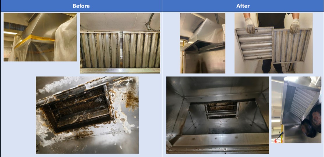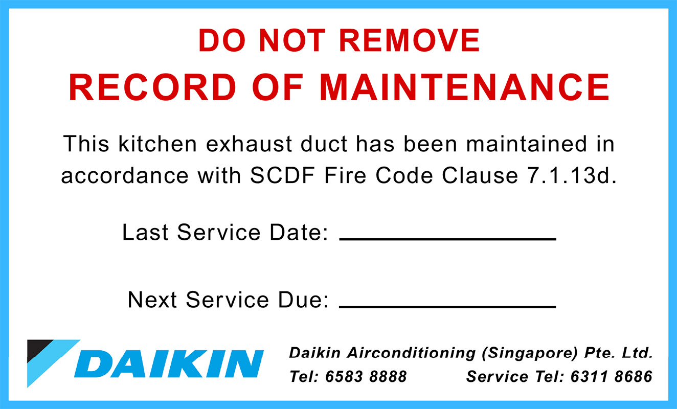 A comprehensive before-and-after cleaning report will be provided to the client for quality assurance and documentation. In addition, there will be a record of maintenance sticker placed on the kitchen exhaust hood. This is in compliance with SCDF Fire Code Clause 7.1.13d which state that records of cleaning and degreasing shall be kept by the owner/ operator for verification. An example of Daikin’s post-KED service report and sticker is shown below.