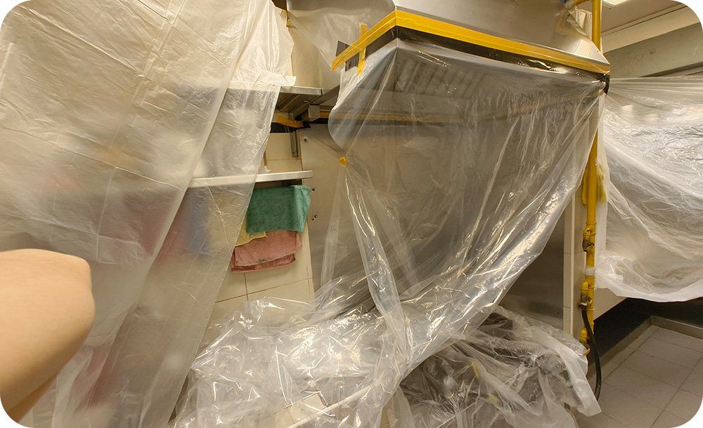 The kitchen area will be covered with plastic protection sheets to prevent any residuals from damaging the kitchen appliances.
