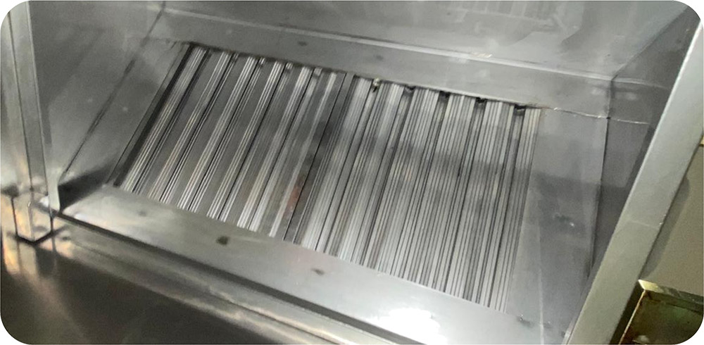 After removing the filter from the hood, the cleaning process begins with the application of degreasing foam to break down grease and grime on the surfaces. Time will be set aside to ensures that the degreasing foam have time to penetrate and loosen the buildup.