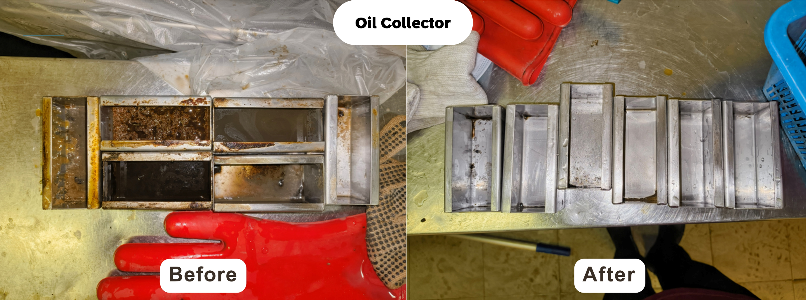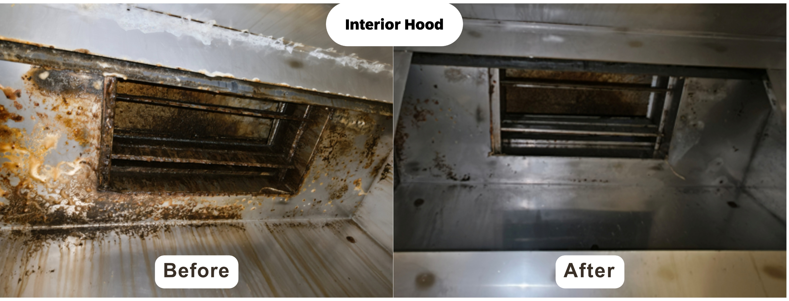 After allowing the foam to settle, manual scraping is performed to thoroughly remove any remaining grease deposits. Once scraping is completed, the surfaces are rinsed in high pressure to wash away all residues.